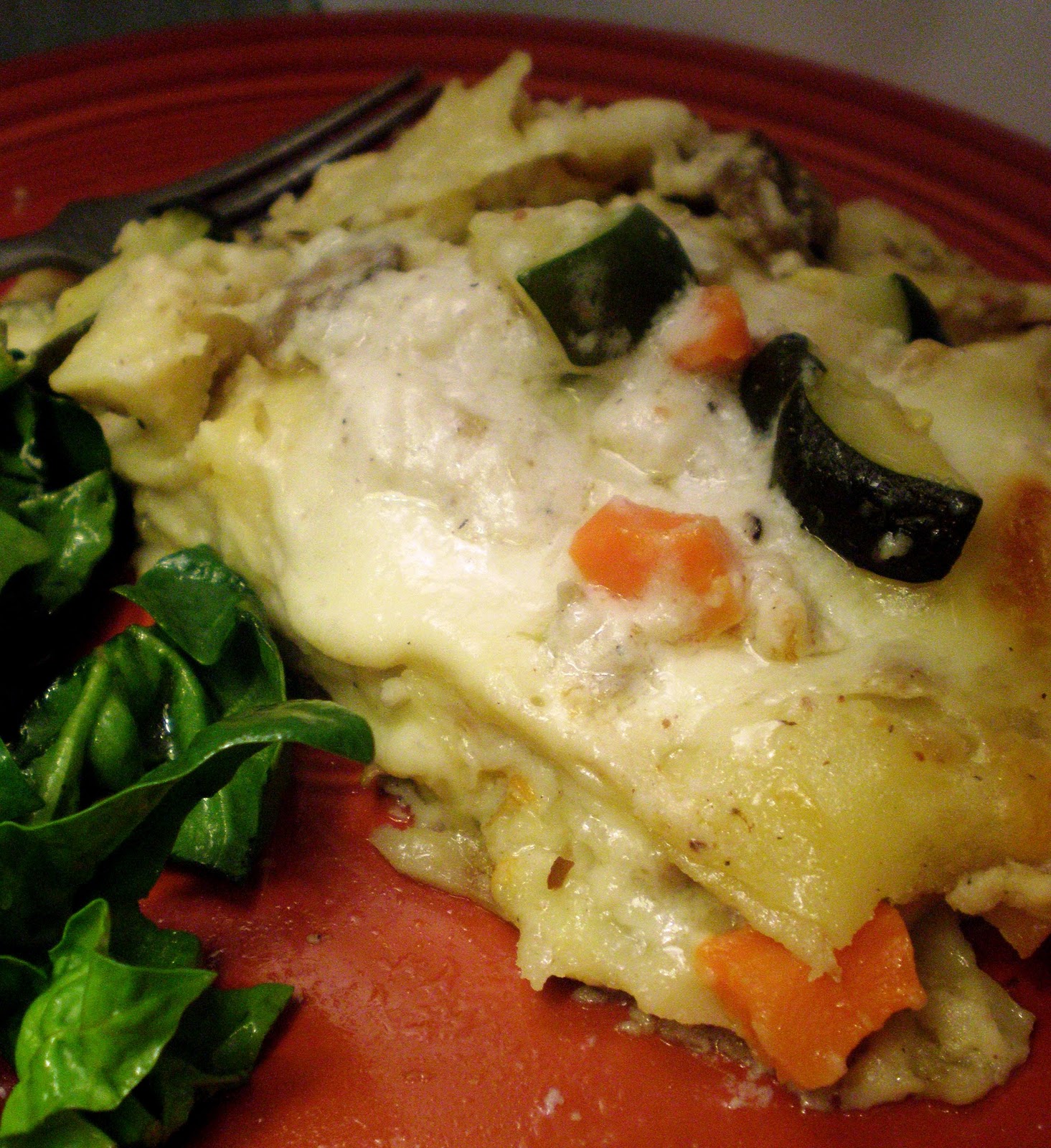 Preheat oven to 425. In a broiler-safe 9x13 pan, coat with butter, then pour 1/2 cup bechamel, then layer 4 lasagna noodles across the pan, slightly overlapping and not touching the sides of the pan (they will expand to meet the sides of the pan). Stir the sauteed vegetables into the remaining bechamel. Spread another layer (about 1/4 of the remaining) of vegetable mixture on top of noodles, then top with 1/4 of the mozzarella. Layer lasagna noodles now again, in the opposite direction as the layer before it. Repeat this process with two more layers of noodles, ending with the remaining bechamel covering the top noodles, the rest of the mozzarella, and 4 T. parmesan.